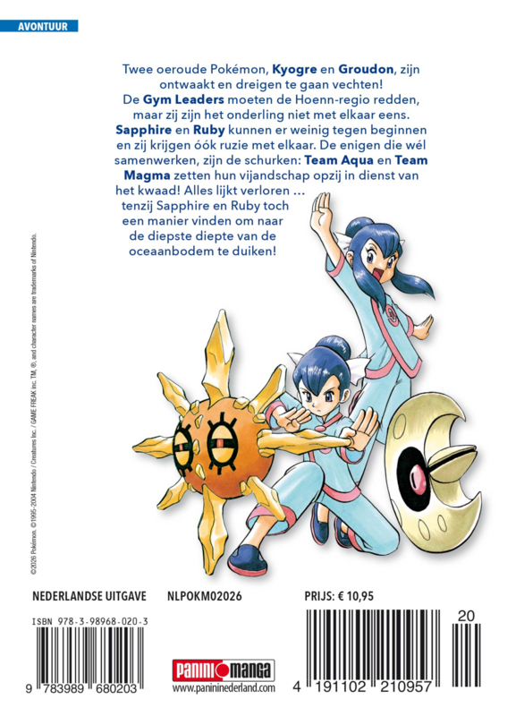 Artikelnummer: 14980De legendarische Pokémon Kyogre en Groudon worden losgelaten en de wereld stort in chaos! Ruby en Sapphire dalen af naar de Zeebodemgrot om ze te stoppen. Tot overmaat van ramp beheersen Archie en Maxie, de leiders van respectievelijk het kwaadaardige Team Aqua en het al even kwaadaardige Team Magma, Kyogre en Groudon met de Blauwe Bol en de Rode Bol. Of zijn het juist de legendarische Pokémon die "hen" beheersen...?!